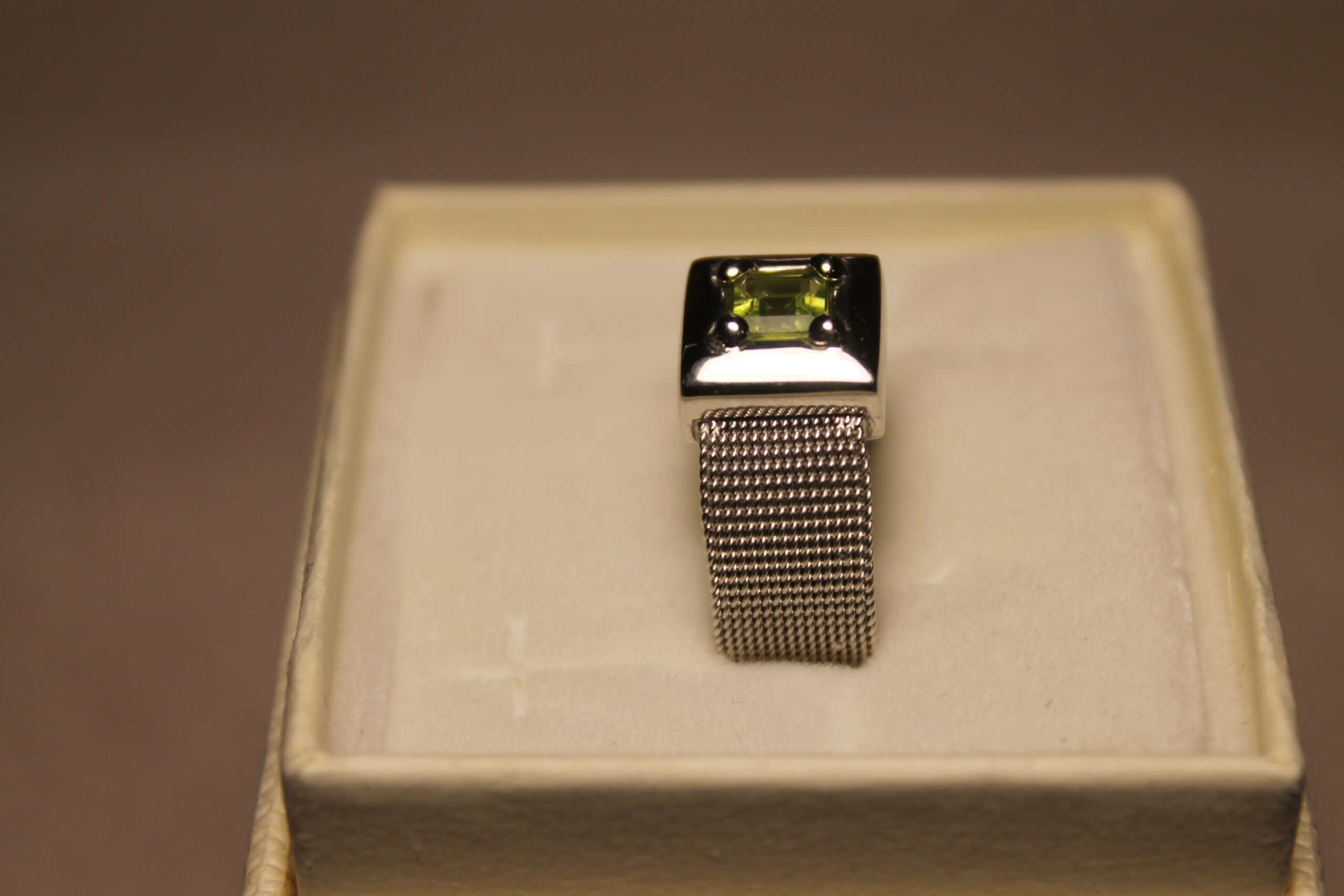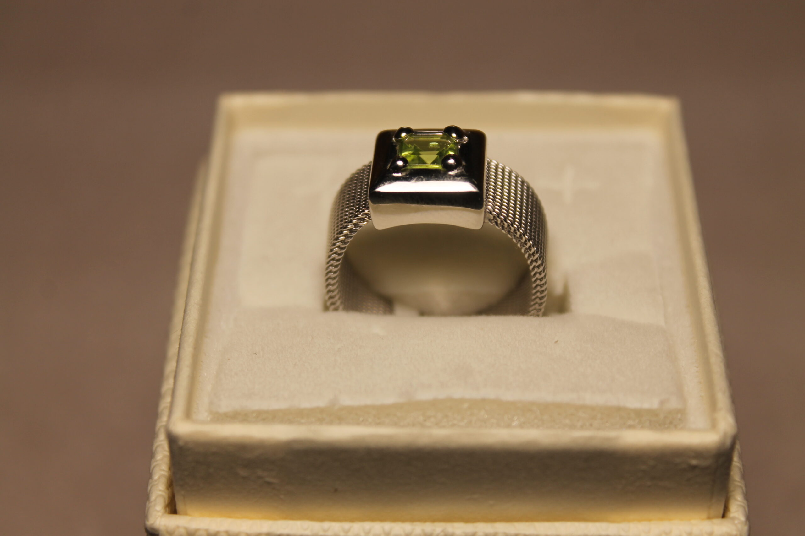 Anello oro bianco con peridotto verde e gambo in maglia Milano morbida